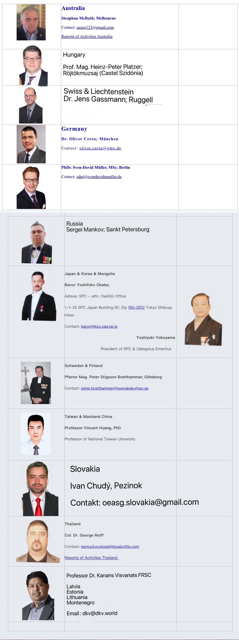 The Austrian Albert Schweitzer Society stay in contact with organisationes and projects worldwide. To have reliable local contact the Board of the OeASG appointed outstanding personalities in various countries representing the society as "Delegat of the OeASG". The following list is sorted alphabethicaly by the name of the country. |